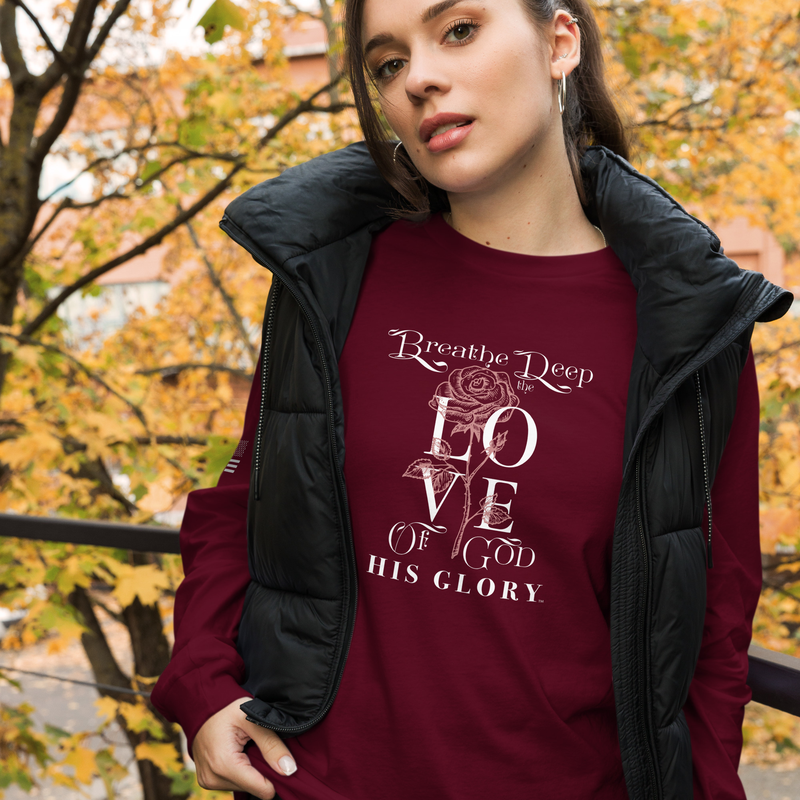 Wrap yourself in comfort and faith with the His Glory “Breathe Deep the Love of God” Long Sleeve Tee. Featuring an elegant rose design and a message of God’s everlasting love, this Christian long sleeve t-shirt pairs beautifully with jeans, jackets, or vests for any season. Soft, versatile, and effortlessly stylish, it’s the perfect layering piece for cooler days and a graceful reminder to rest in His presence wherever you go.