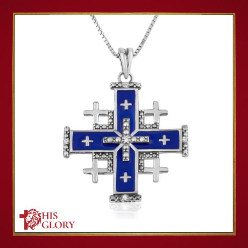 Bear witness to your faith in the Lord with this meaningful necklace! Crafted from sterling silver, this Jerusalem Cross pendant is decorated with deep blue enamel in the main center cross. All four ends of it are embellished with a dotted design, as well as a single gemstone in each one. The small silver cross in the center repeats this design, and there is a gemstone embedded in its center as well. Meaningful and unique, this necklace will make a fantastic gift for a loved one!