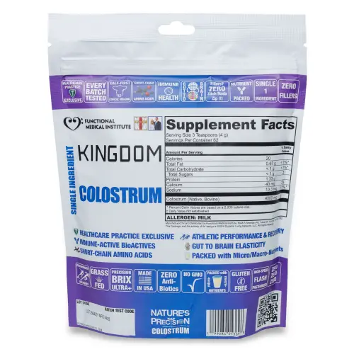 Kingdom Colostrum is rich in immunoglobulins (antibodies), growth factors, and bioactive peptides that help support the body's natural defenses. It's often called "nature's first food" because it provides foundational nutrition right from the start of life. Bovine colostrum is remarkably similar to human colostrum and has been studied extensively for its potential benefits for gut lining integrity and immune system function.